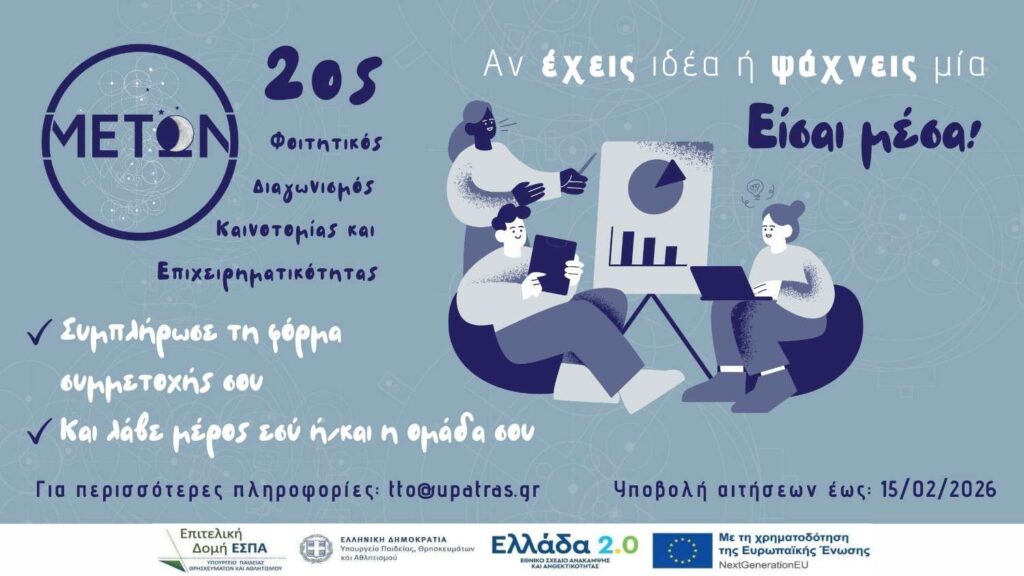 | Ο 2ος Φοιτητικός Διαγωνισμός Καινοτομίας και Επιχειρηματικότητας «ΜΕΤΩΝ» ξεκινά! Το Πανεπιστήμιο Πατρών διοργανώνει για δεύτερη φορά τον Φοιτητικό Διαγωνισμό Καινοτομίας και Επιχειρηματικότητας «ΜΕΤΩΝ» με στόχο την ανάδειξη καινοτόμων ιδεών των φοιτητών του.Ο διαγωνισμός, που υλοποιείται με την υποστήριξη του Τμήματος Μεταφοράς Τεχνολογίας Καινοτομίας και Επιχειρηματικότητας, απευθύνεται σε προπτυχιακούς και μεταπτυχιακούς φοιτητές, καθώς και σε υποψήφιους διδάκτορες του Πανεπιστημίου Πατρών. Στόχος του είναι η αξιοποίηση της επιστημονικής γνώσης μέσω της μετατροπή καινοτόμων ιδεών σε προϊόντα και υπηρεσίες η καλλιέργεια του επιχειρηματικού πνεύματος. Γιατί να συμμετάσχετε: Ενδυνάμωση της επιχειρηματικότητας: Αναπτύξτε δεξιότητες και αποκτήστε γνώσεις για να υλοποιήσετε καινοτόμες λύσεις με κοινωνικό, περιβαλλοντικό και οικονομικό αντίκτυπο. Μετατροπή ιδεών σε πράξη: Λάβετε υποστήριξη και καθοδήγηση για να μετατρέψετε τις πρωτοποριακές ιδέες σας σε βιώσιμα επιχειρηματικά εγχειρήματα. Δωρεάν συμμετοχή: Ο διαγωνισμός είναι ανοιχτός σε όλους τους φοιτητές και απόφοιτους του Πανεπιστημίου Πατρών, χωρίς οικονομική επιβάρυνση. Η υποβολή αιτήσεων γίνεται ηλεκτρονικά έως τις 15/02/2026. Για εγγραφή, οι ενδιαφερόμενοι μπορούν να δηλώσουν τη συμμετοχή τους εδώ 🔗Για περισσότερες πληροφορίες επικοινωνήστε με το Τμήμα Μεταφοράς Τεχνολογίας, Καινοτομίας και Επιχειρηματικότητας του Πανεπιστημίου Πατρών στο tto@upatras.gr Έργο: SUB2: «Πανεπιστήμια Αριστείας» με κωδικό ΟΠΣ ΤΑ 5180665 στο Ταμείο Ανάκαμψης και Ανθεκτικότητας «Ελλάδα 2.0» Το έργο υλοποιείται στο πλαίσιο του Εθνικού Σχεδίου Ανάκαμψης και Ανθεκτικότητας «Ελλάδα 2.0» με τη χρηματοδότηση της Ευρωπαϊκής Ένωσης – NextGenerationEU |