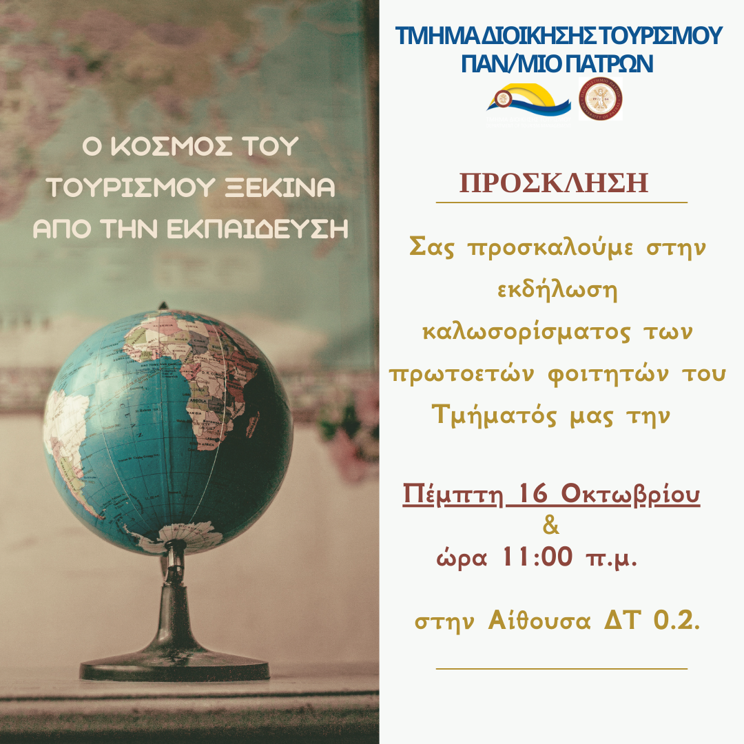 Εκδήλωση Καλωσορίσματος Α’ ετών φοιτητών/τριών Τμήματος_Πέμπτη 16 Οκτωβρίου 2025_ώρα 11:00 π.μ._αίθουσα Δ.Τ2 Τμήμα Διοίκησης Τουρισμού 2025-26Download Πρόγραμμα Εκδήλωσης 2025-26Download